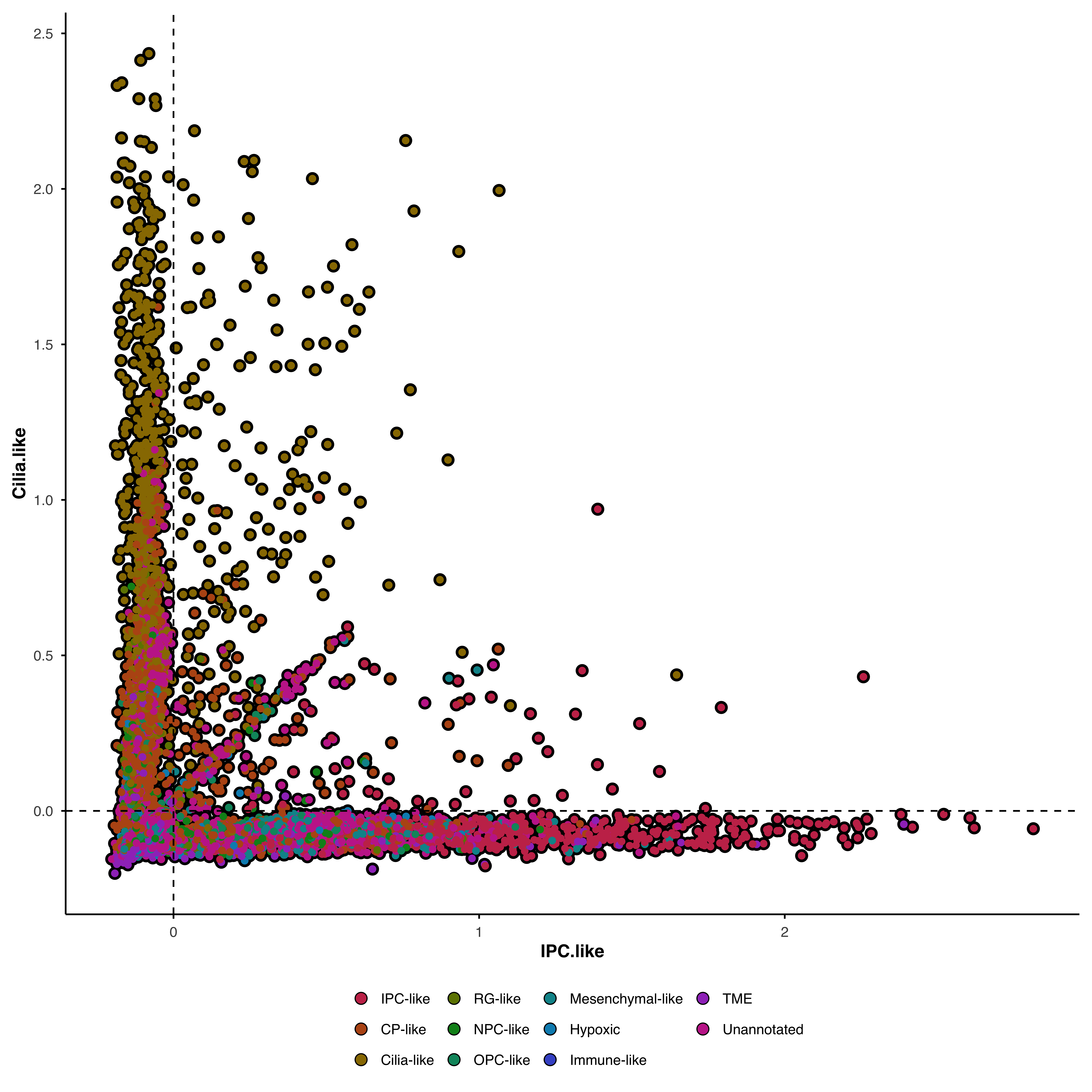 Cells are positioned by their enrichment scores: X-axis shows one signature, Y-axis shows the other.