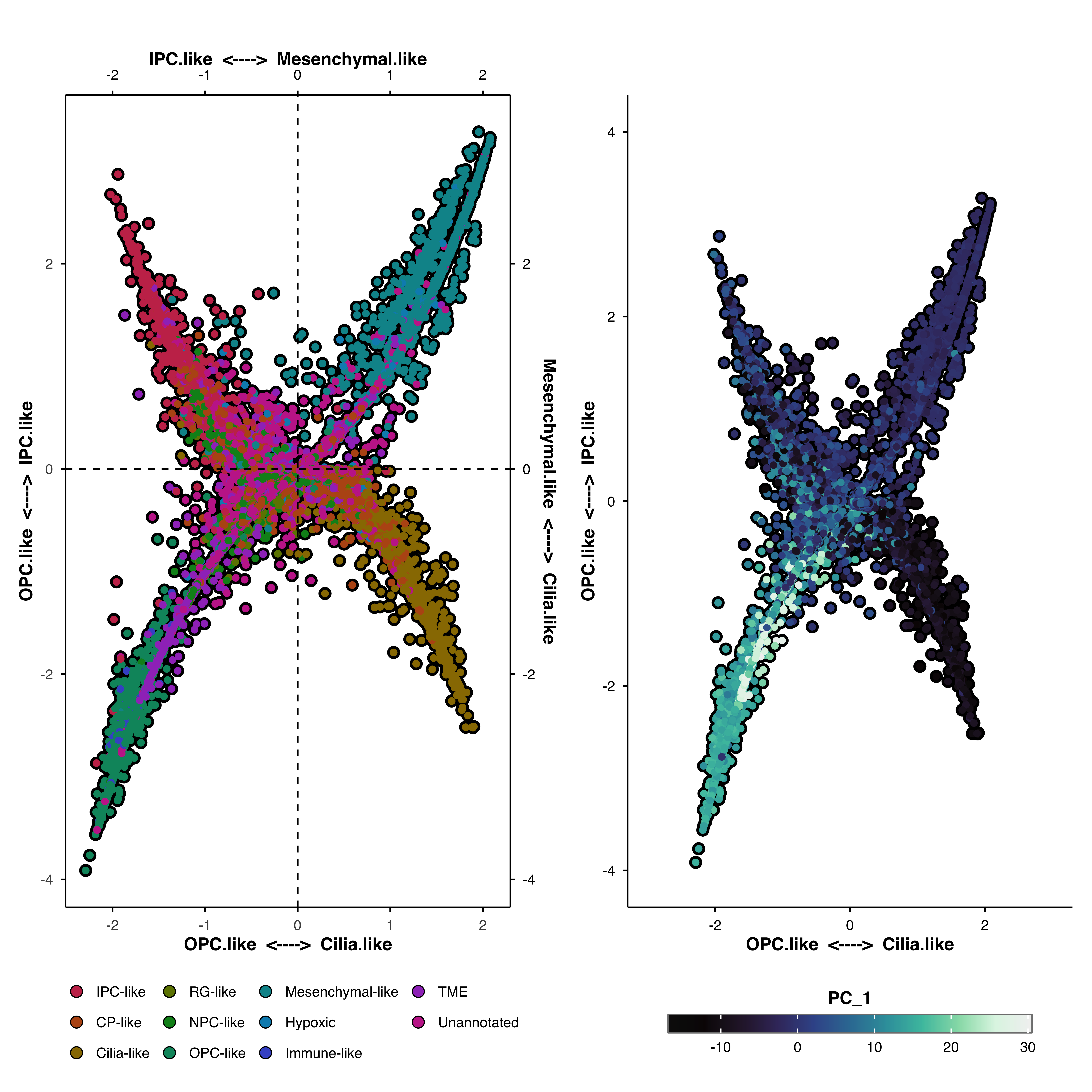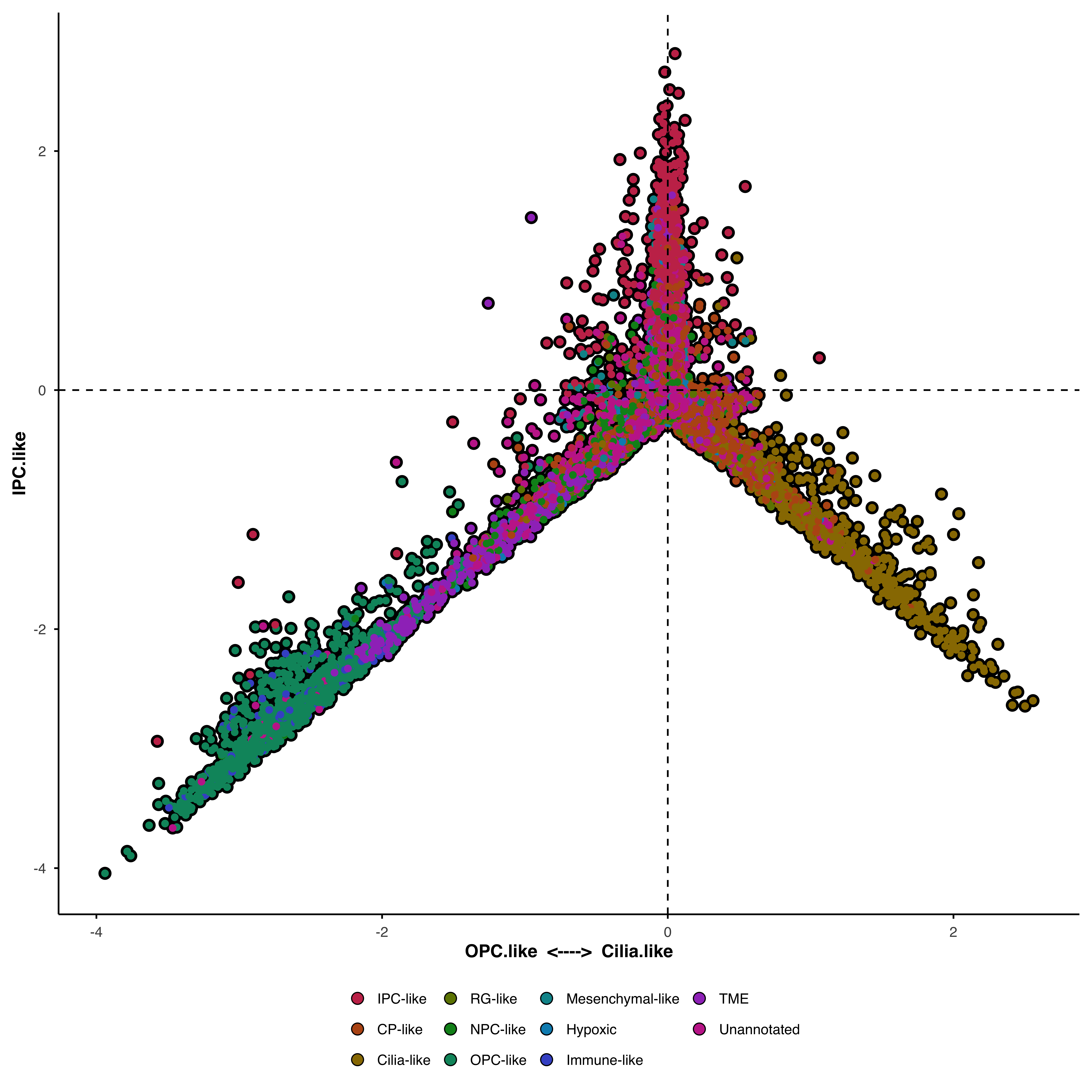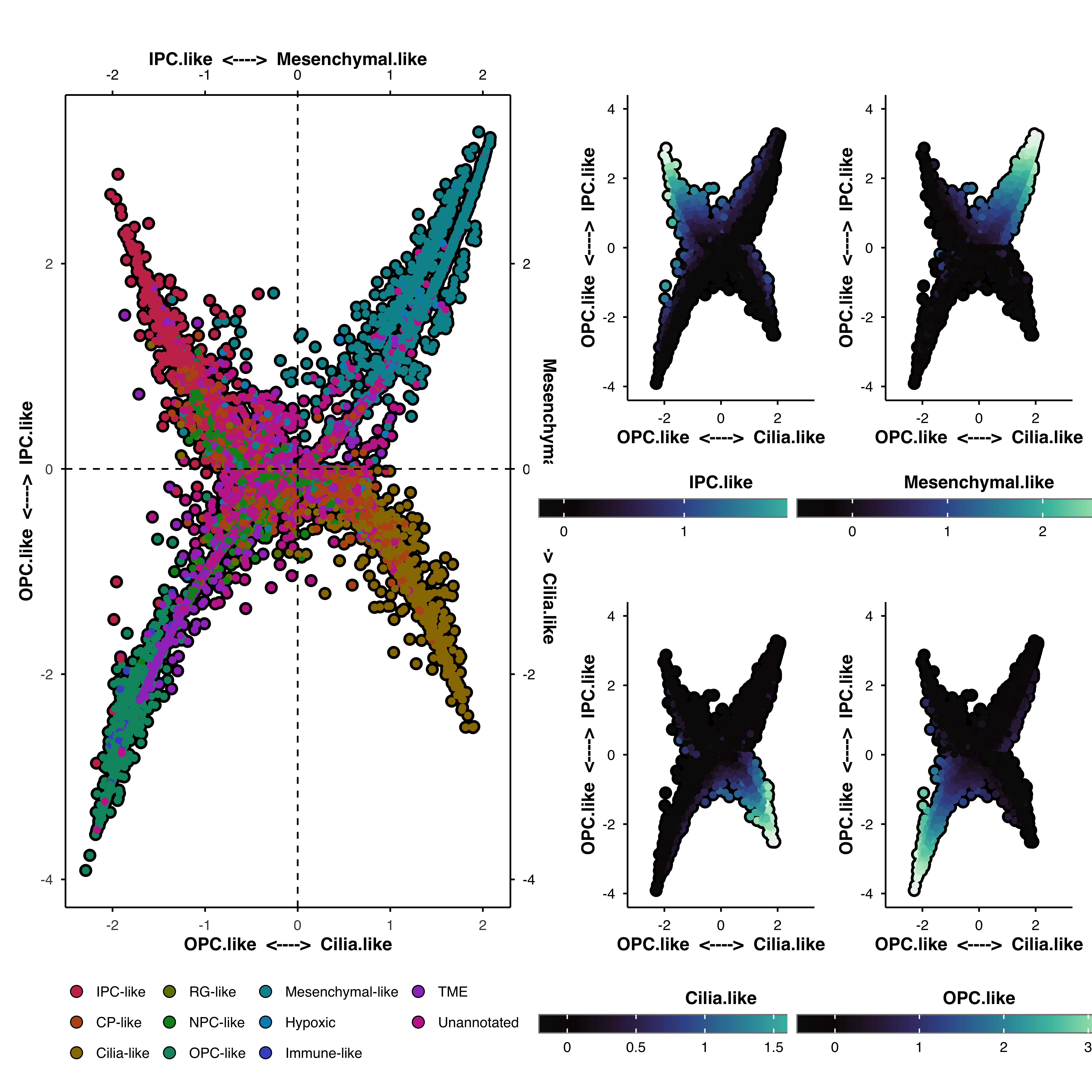 p $ main | ( ( p $ IPC.like | p $ Mesenchymal.like ) / ( p $ Cilia.like | p $ OPC.like ) )