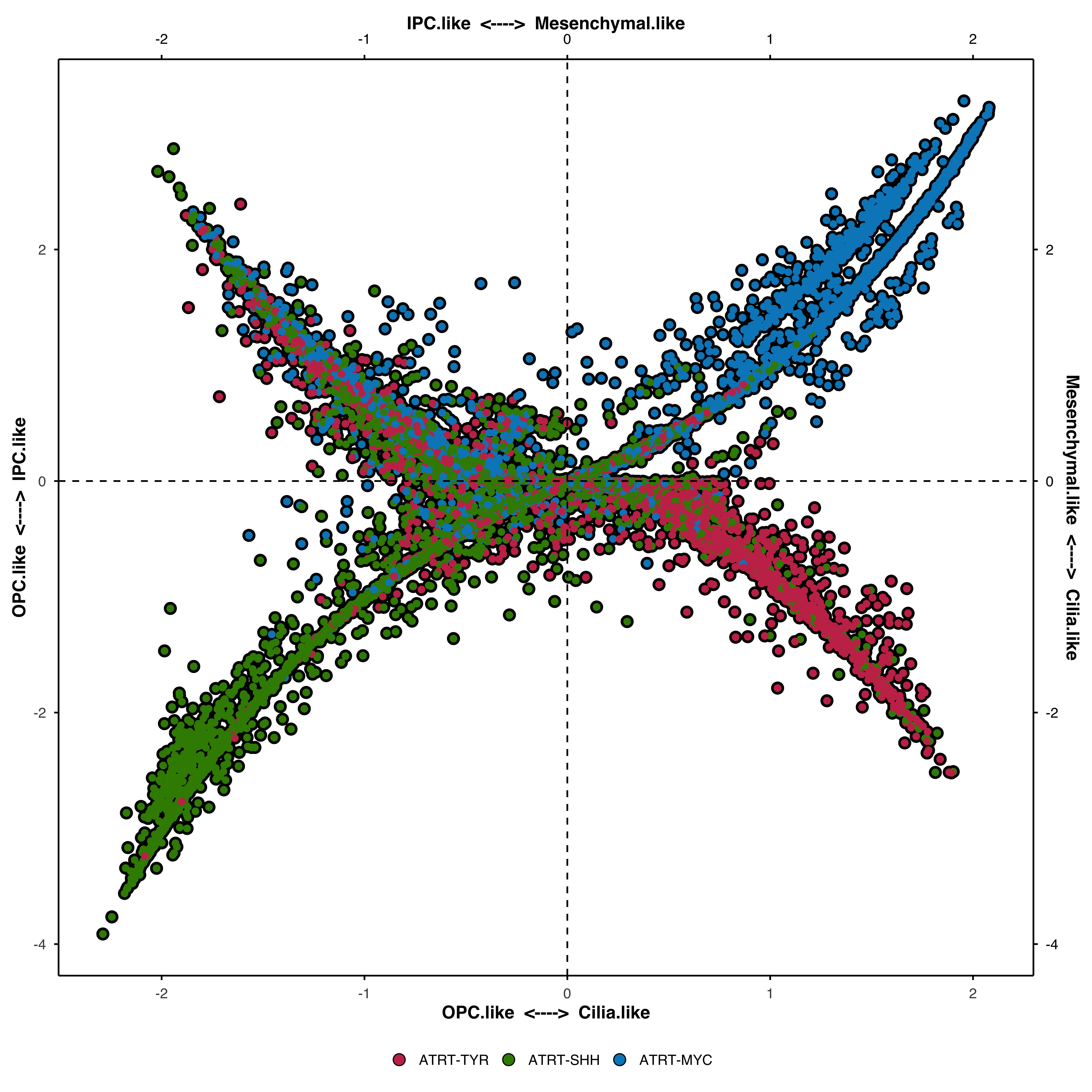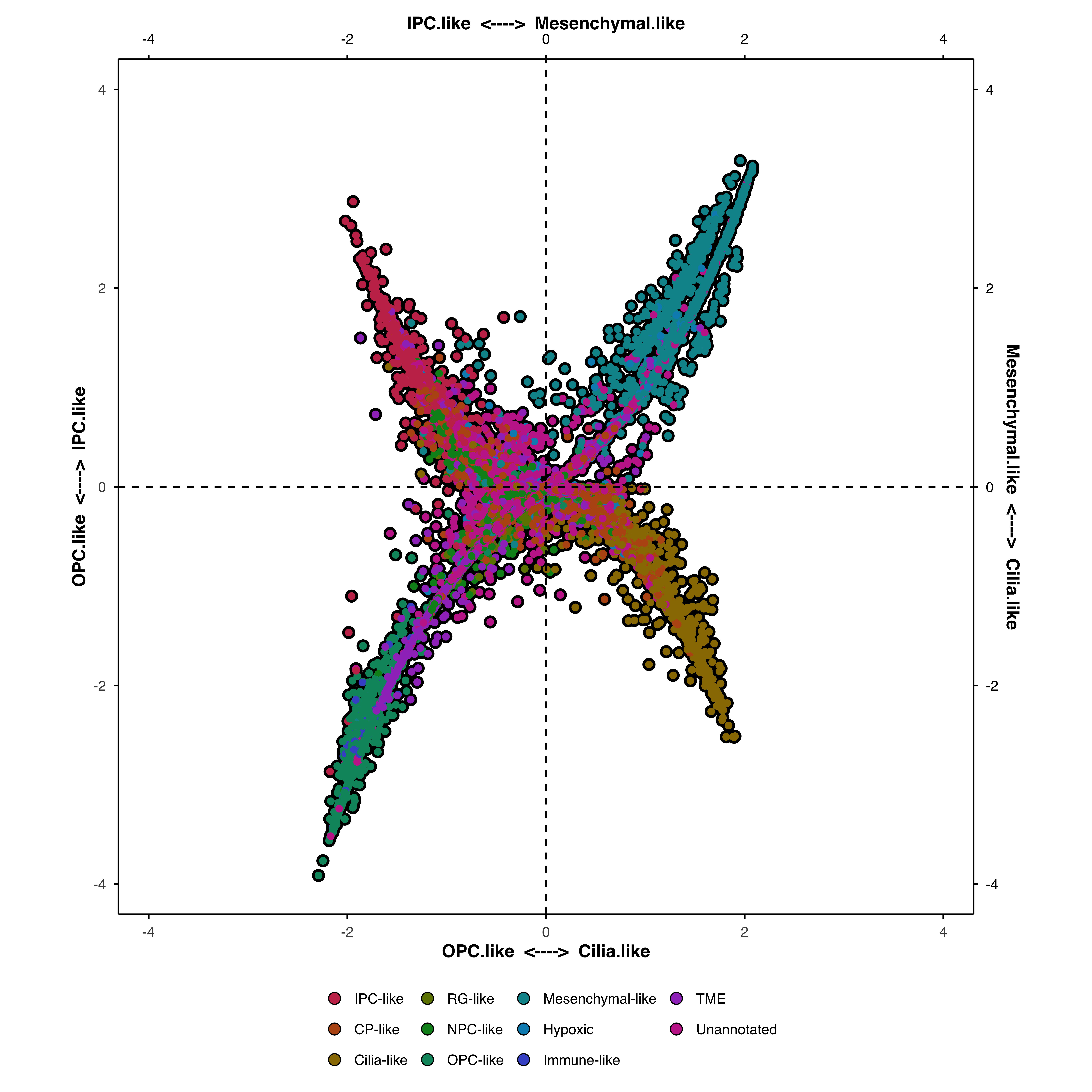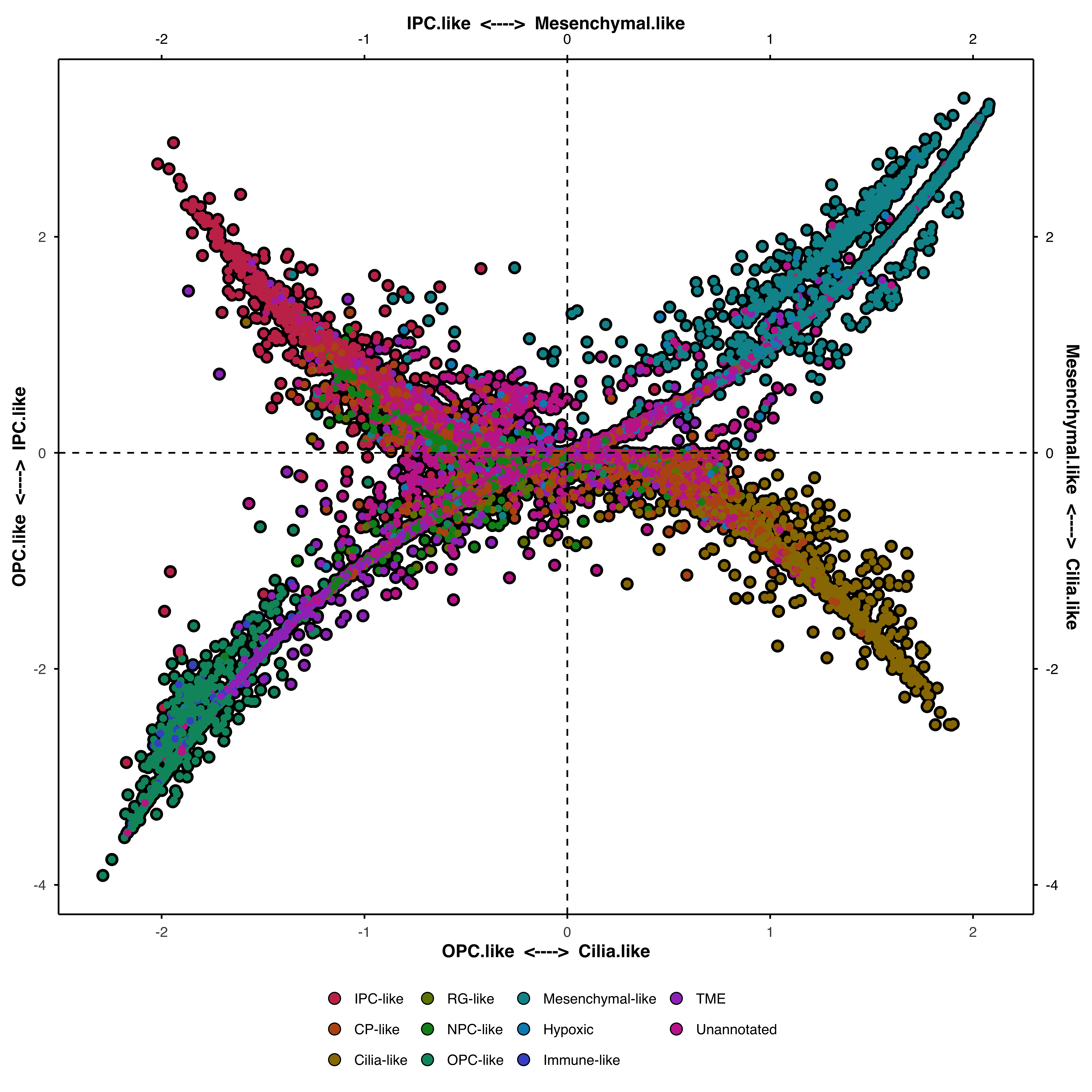Cells cluster toward corners they’re enriched in, or fall between corners if enriched in multiple states.