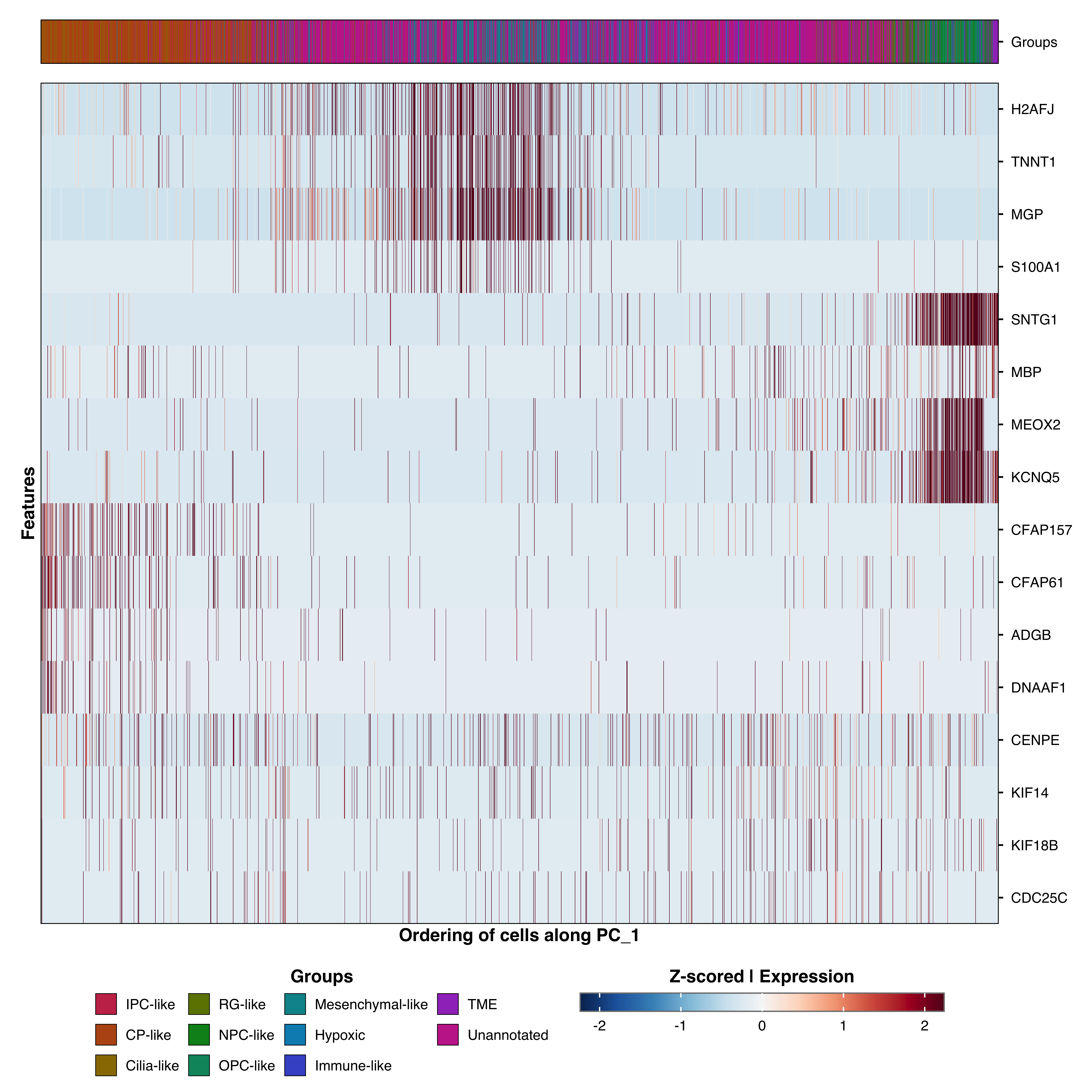 Ranked expression heatmaps display gene expression ordered by a dimensional reduction component . Cells are ranked along a PC, UMAP dimension, or trajectory score, revealing expression patterns along continuous gradients.