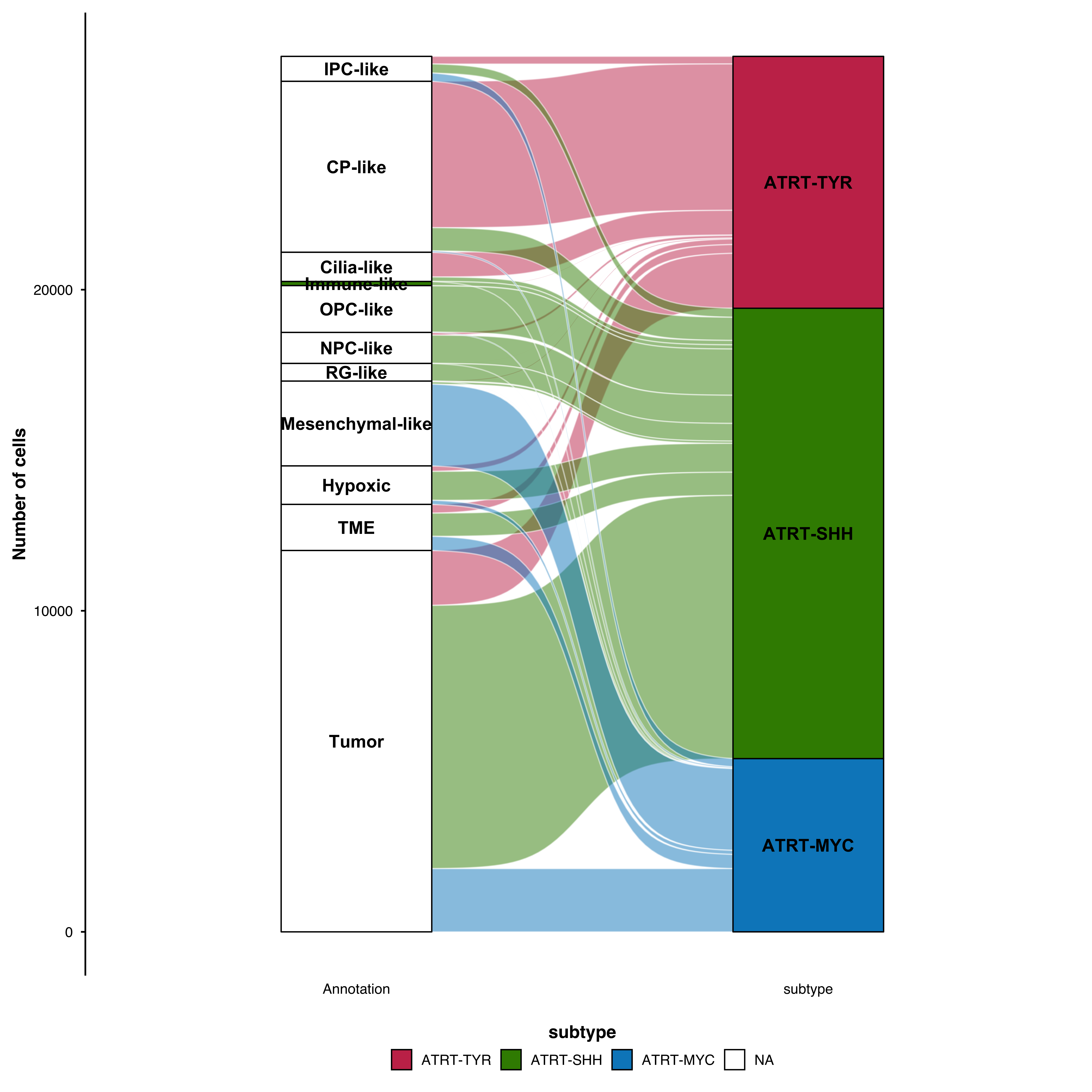 Alluvial plots visualize how cells flow between categorical groups—for example, how cluster assignments change across conditions, time points, or annotation methods. Built on the ggalluvial package.