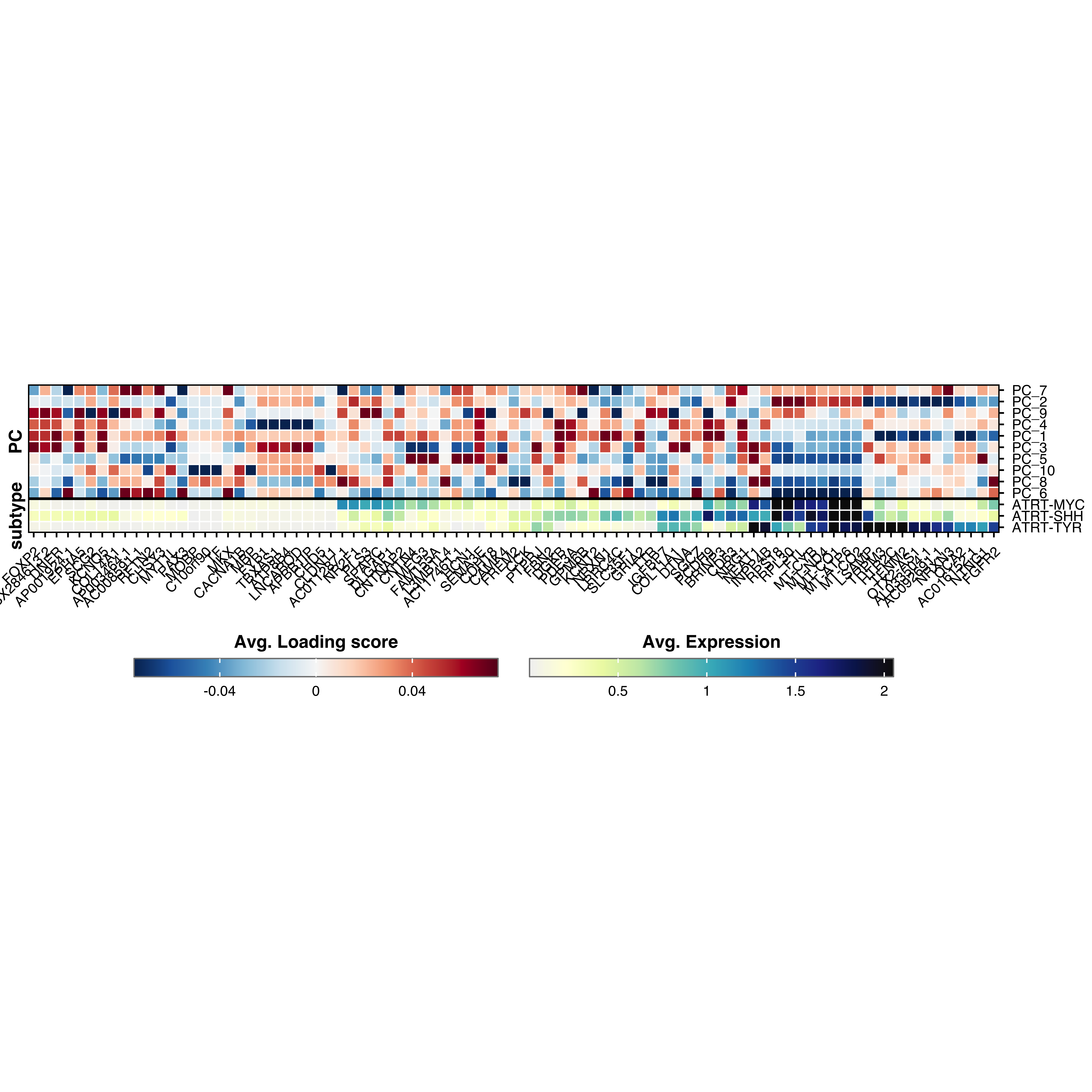 Loadings heatmaps show which genes contribute most to principal components. Displays top and bottom scoring genes for each PC alongside their expression levels.