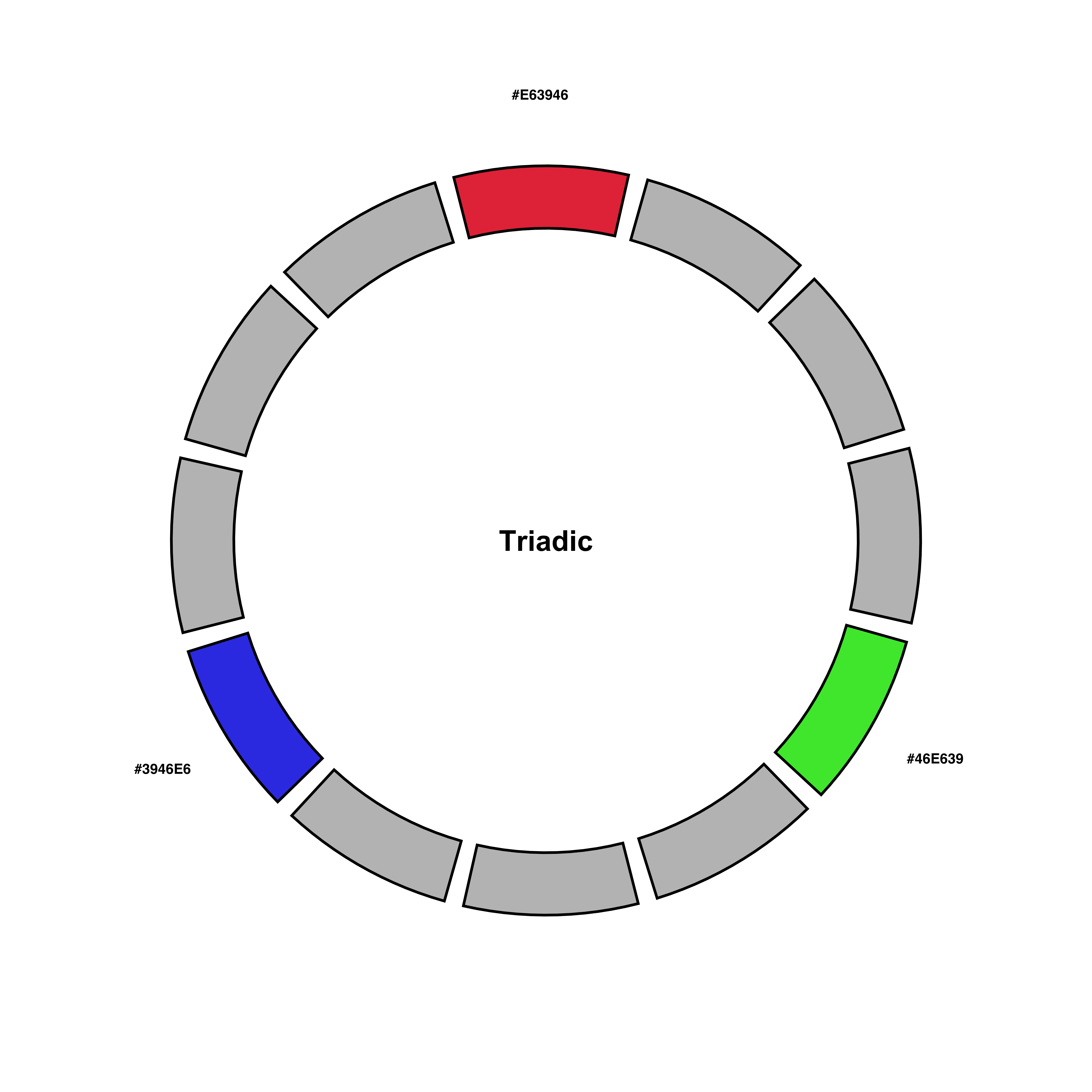 #> [1] "#E63946" "#E68239" "#E6399C"Triadic scheme